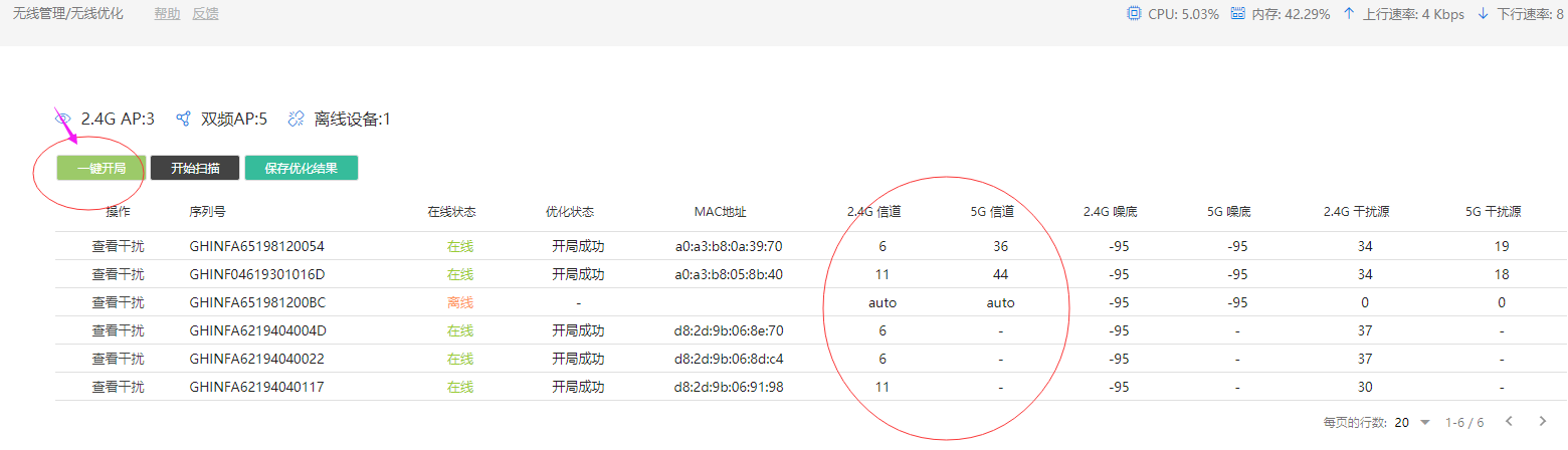 点击一键开局按钮后,可以查看到2.4G信道和5G信道动态发生了变化,根据实际情况,决定采用合适的信道。