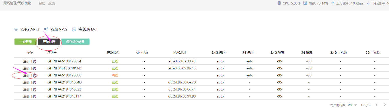 如果要查看网络中每个AP的干扰情况等,可以先点击“开始扫描”,在获取到扫描结果后,进行查看详细情况