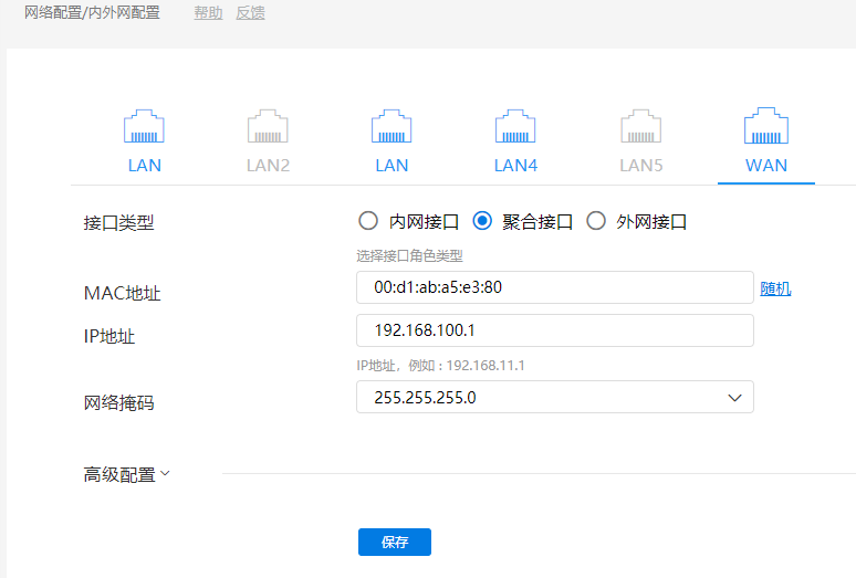 选中WAN口,将接口类型选择为聚合接口,输入IP地址和子网掩码,点击打开高级设置,可配置DHCP相关信息。