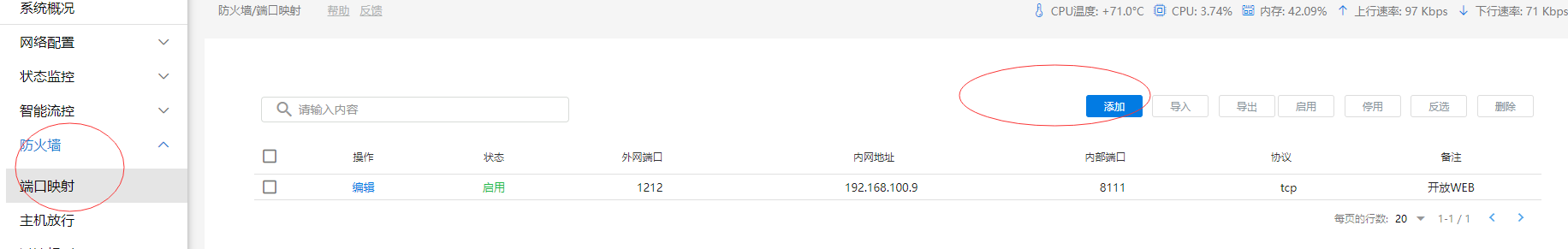 点击打开防火墙->端口映射,可以看到支持,单个添加, 也支持批量导入添加等功能,