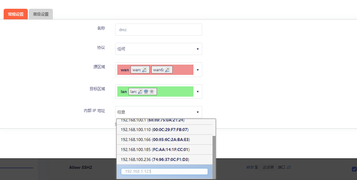 内部IP地址:可以从下拉菜单中选择目标IP,或者自定义输入。