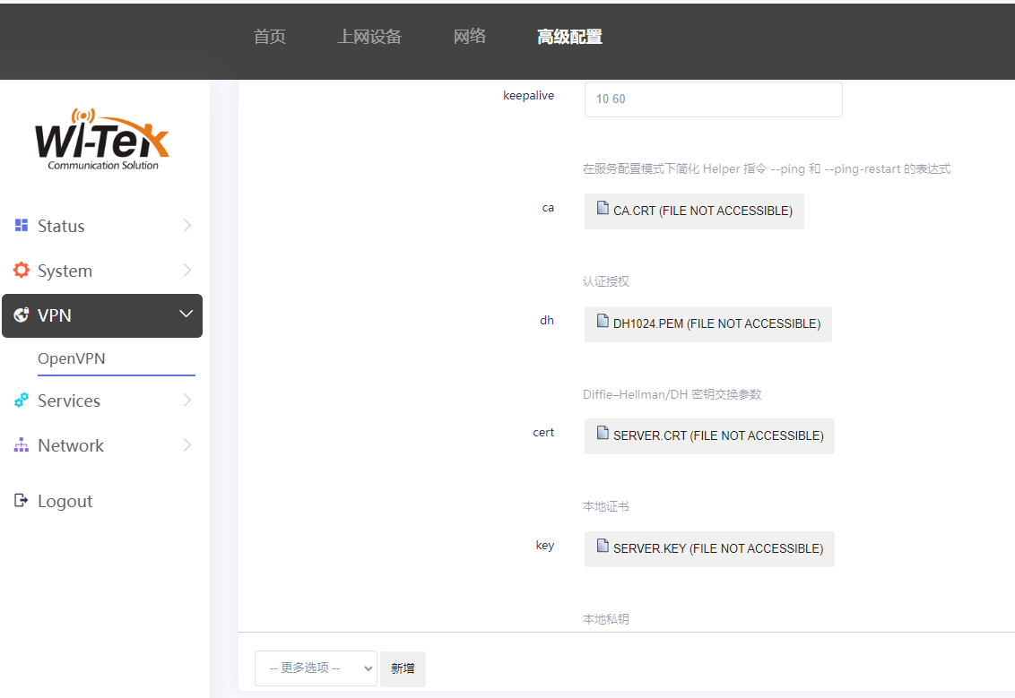 2、然后,依次点击ca、cert、dh、 key, 上传对应的证书new_ca.crt, combway.crt, new_dh.pem、combway.key,并选择对应的配置文件名称, 完成后,点击保存并应用