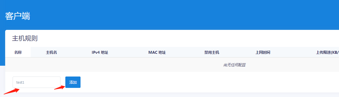 - 填写客户端硬件地址(上网设备页添加会自动填写)、选择时间、禁用主机、填写上下行限速信息。