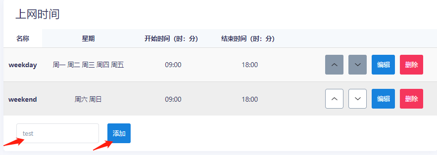 系统默认设置了工作时间(名称:weekday)、休息时间(名称:weekend)两条规则,可以按需修改使用。