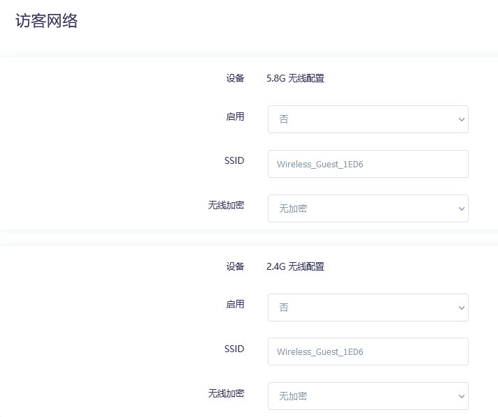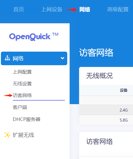 简介访客网络简介访客网络提供了独立的无线接入模式,让该无线名称下的节点可以访问互联网,但是不能访问内网。访客网络可以配置开启/关闭访客网络,同时设置无线名与加密信息。页面配置路径:网络》访客网络访客网络这里可以单独开启/关闭5G与2.4G无线的访客接入,可以分别设置访客网络的无线名称,加密方式以及密码。文档更新时间: 2022-03-16 18:24 作者:hawkbee